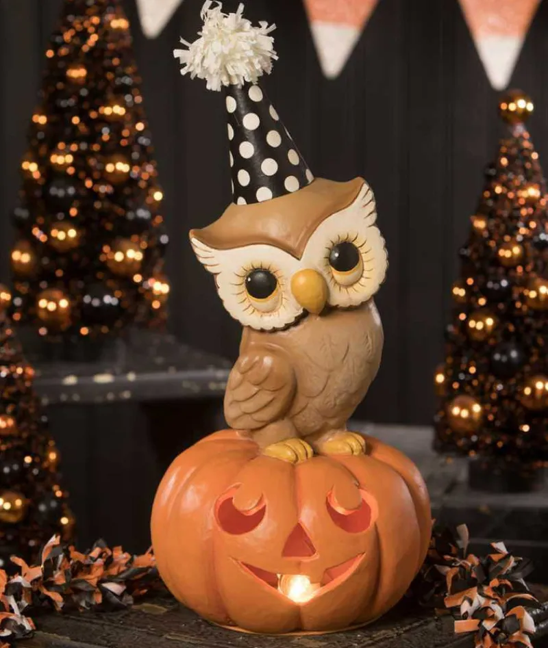 This wonderful collectible is the item TL9435 – Party Owl On Pumpkin Medium from Bethany Lowe Designs