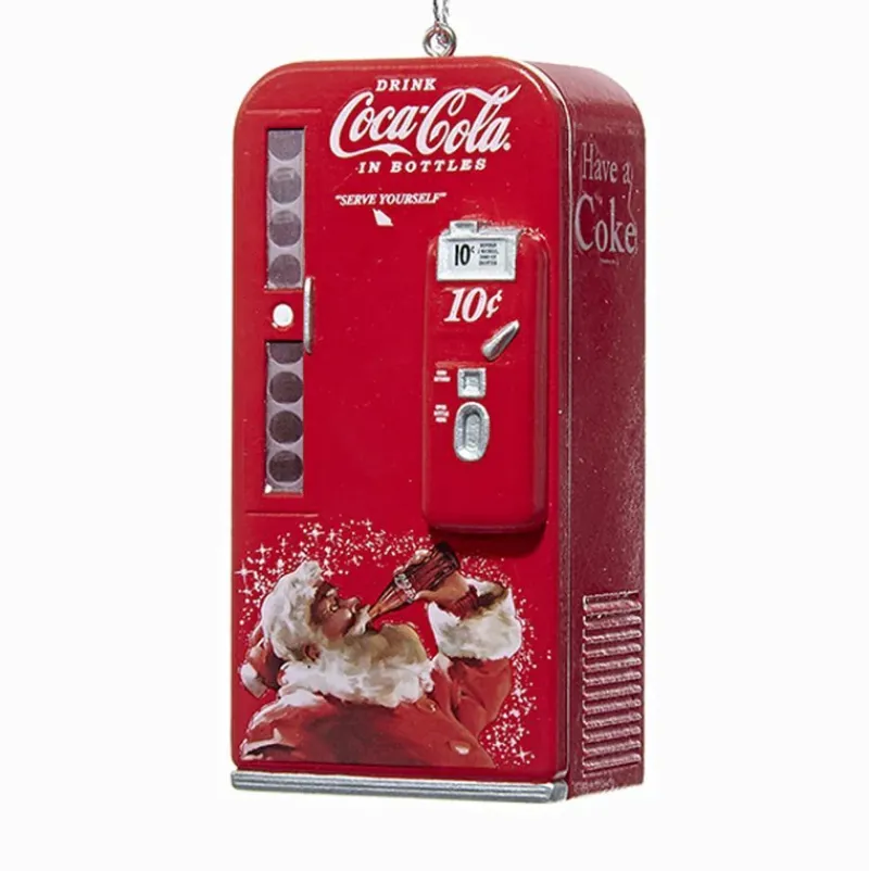 This Kurt Adler vintage Coca-Cola® vending machine with Santa ornament adds the perfect touch of nostalgia to any holiday décor or Christmas tree. This ornament features a bright red vintage Coca-Cola® vending machine complete with prices and Coca-Cola® slogans printed on the side, and at the bottom of the vending machine is a picture of Santa enjoying a refreshing Coca-Cola®.