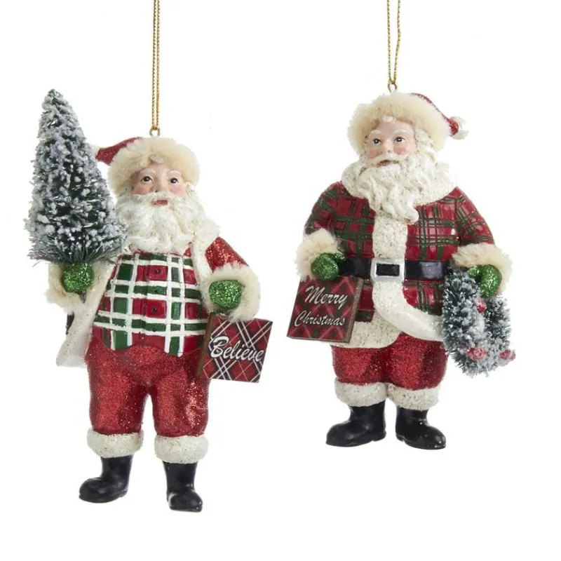 These Santa ornaments from Kurt Adler are classic addition to your holiday décor or Christmas tree. Each Santa in this assortment features a glittered red, white and green plaid Santa suit with green glittered mittens. One Santa holds a miniature snowy Christmas tree and a plaid “Believe” sign and the other Santa holds a snowy wreath and a plaid “Merry Christmas” sign.